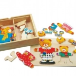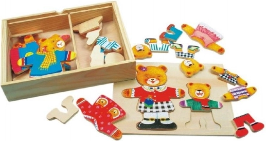 Puzzle da vestire in legno di Bino offre divertimento e apprendimento in un unico pratico pacchetto. I bambini possono inserire i pezzi nel coperchio della scatola e creare vari abiti per gli orsi secondo la propria fantasia.