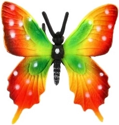 Tonalità intense di verde, rosso e giallo con un disegno a contrasto sulle ali riproducono fedelmente le farfalle tropicali del genere Papilio, catturando lo sguardo in qualsiasi ambiente.