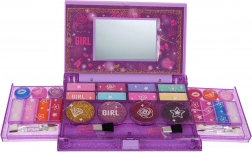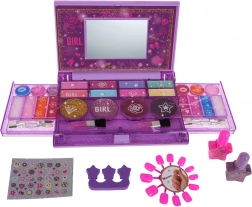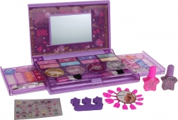 - astuccio pieghevole con specchietto, 8× ombretti, 14× lucidalabbra, 6× pennello, 2× smalto per unghie con glitter, adesivi per unghie, unghie finte, separatore per dita