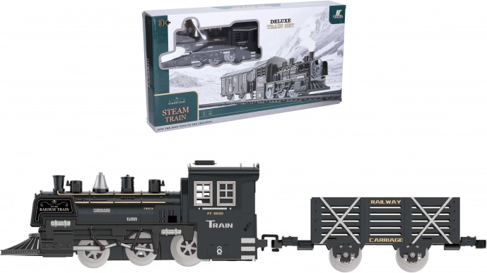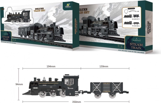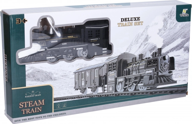 Set del treno con binari 75 × 75 cm, locomotiva 19,5 cm, effetti luminosi, sonori e di fumo. Controllo ON/OFF, alimentazione 4× AA. Ottimo regalo per bambini.