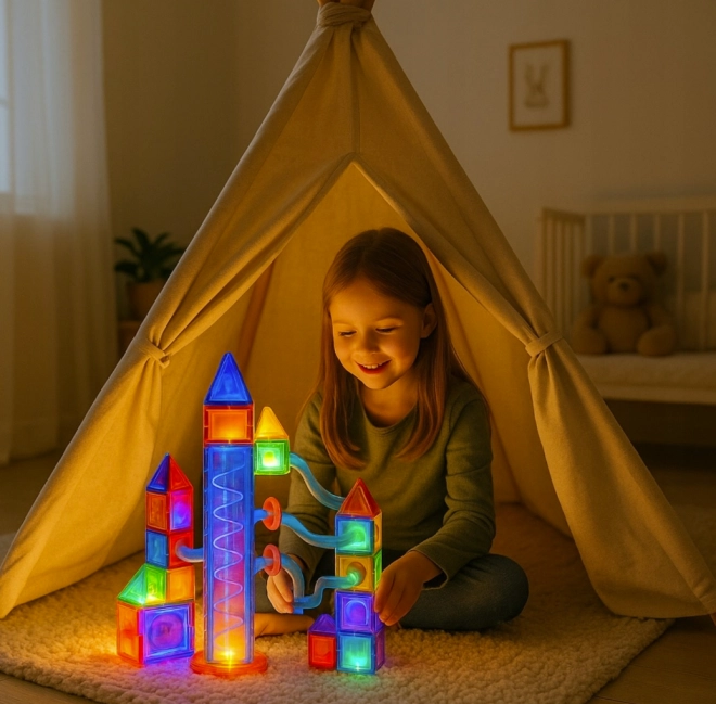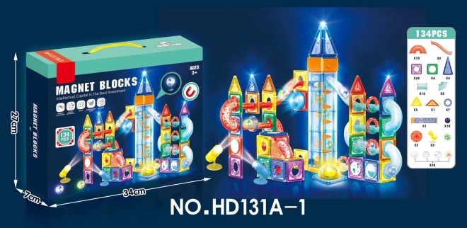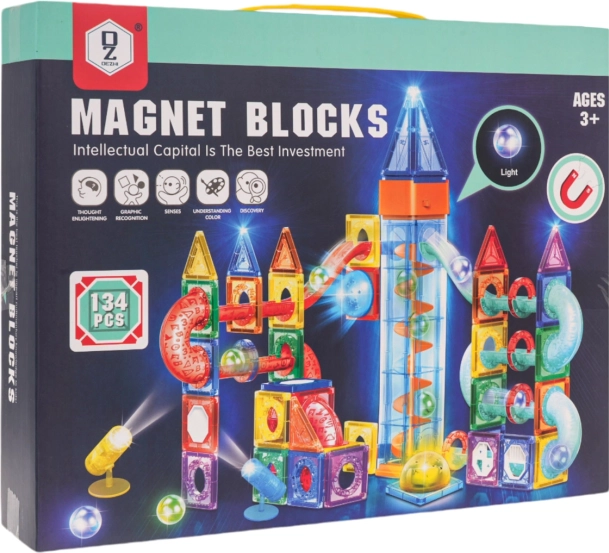 Scopri il set di Costruzioni Magnetiche Illuminanti, 134 pezzi per bambini dai 3 anni. Crea percorsi con palline luminose, LED e proiettori, il tutto alimentato da batterie!
