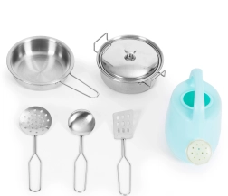 Inclusi pentola con coperchio, padella, due spatole, mestolo e piccola teiera: tutto pronto per piccoli esperimenti culinari.