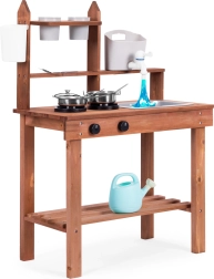 Favorisce i giochi di ruolo e permette ai bambini di “cucinare” con sabbia, terra o sassolini. Gli scaffali ordinati e i ganci tengono le stoviglie a portata di mano, mentre le dimensioni compatte ne facilitano il posizionamento anche negli spazi più piccoli.