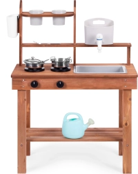 Scopri il divertimento in giardino e in casa con la cucina per bambini in legno di abete di ECOTOYS. Offre un rubinetto funzionante con serbatoio, manopole girevoli del fornello con scatto e accessori in metallo. Grazie alla struttura solida e sicura è ideale per bambini dai 3 anni e stimola creatività, fantasia e sviluppo della motricità fine.