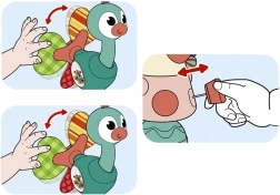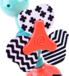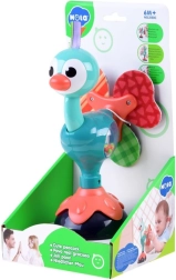 Il simpatico pavone combina parti lisce in plastica e morbidi elementi tessili sulla coda per offrire al neonato texture e stimoli diversi. Una volta fissato con la ventosa, il giocattolo ruota attorno al proprio asse e, durante il movimento, emette un delicato suono tintinnante che motiva i bambini ad afferrare ed esplorare.