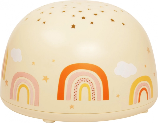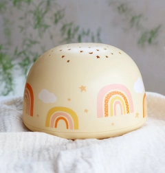 Questa lampada notturna color giallo vaniglia con motivo arcobaleno proietta stelle su pareti e soffitto della cameretta e aiuta i bambini ad addormentarsi serenamente. Grazie alle dimensioni compatte è facile da trasportare e il funzionamento senza fili a batterie la rende un accessorio ideale per ogni cameretta.