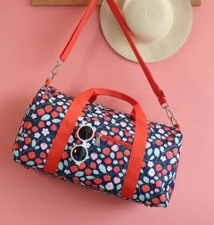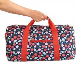 Leggera e spaziosa borsa da viaggio per bambini di A Little Lovely Company con motivo alle fragole, ideale per attività, gite nel weekend e come bagaglio a mano in aereo. Dispone di un scomparto principale con tasca interna, due tasche laterali e una tasca frontale con zip, realizzata in poliestere resistente con tracolla rimovibile per un trasporto confortevole.