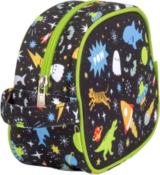 Elegante beauty case per bambini con motivo di razzi, pianeti e stelle, ideale per gite, campi e vacanze. Offre un scomparto capiente per tutti gli articoli per l'igiene e ha una comoda maniglia per un facile trasporto e appensione. Il resistente tessuto con chiusura lampo sicura mantiene tutto in ordine al suo posto.
