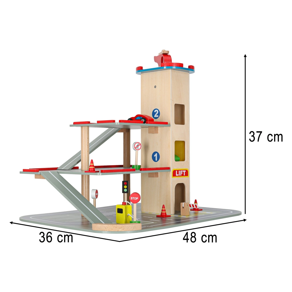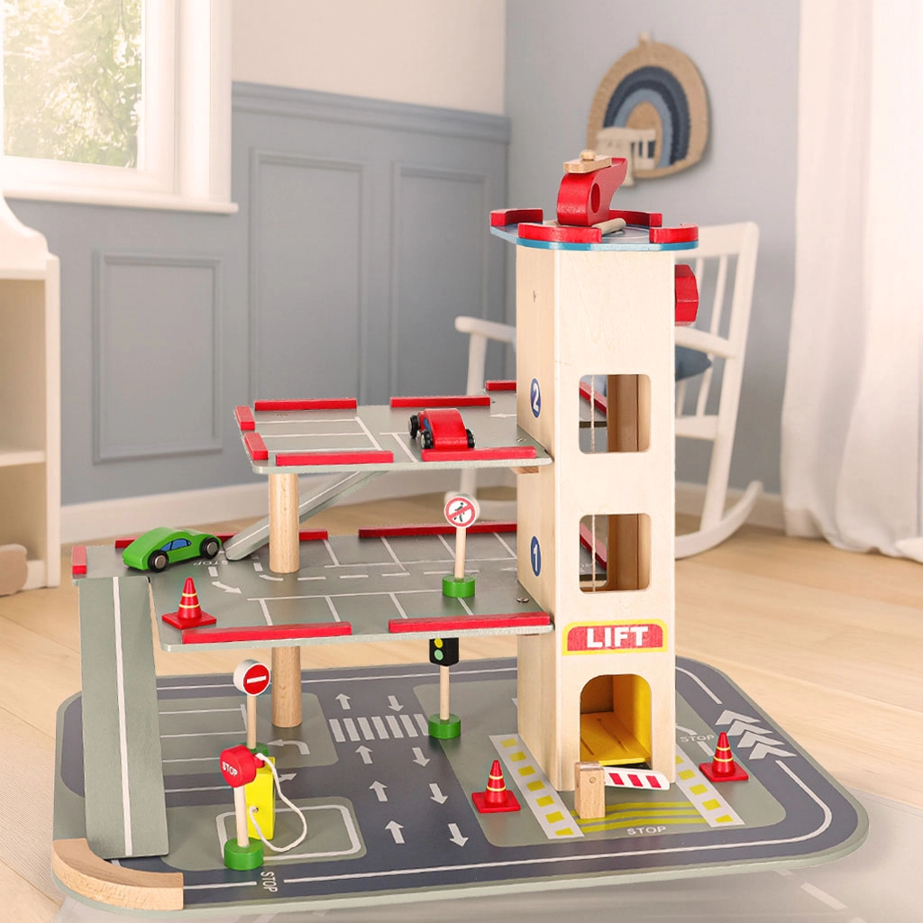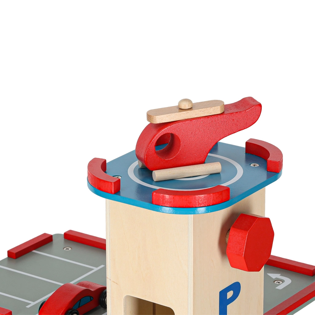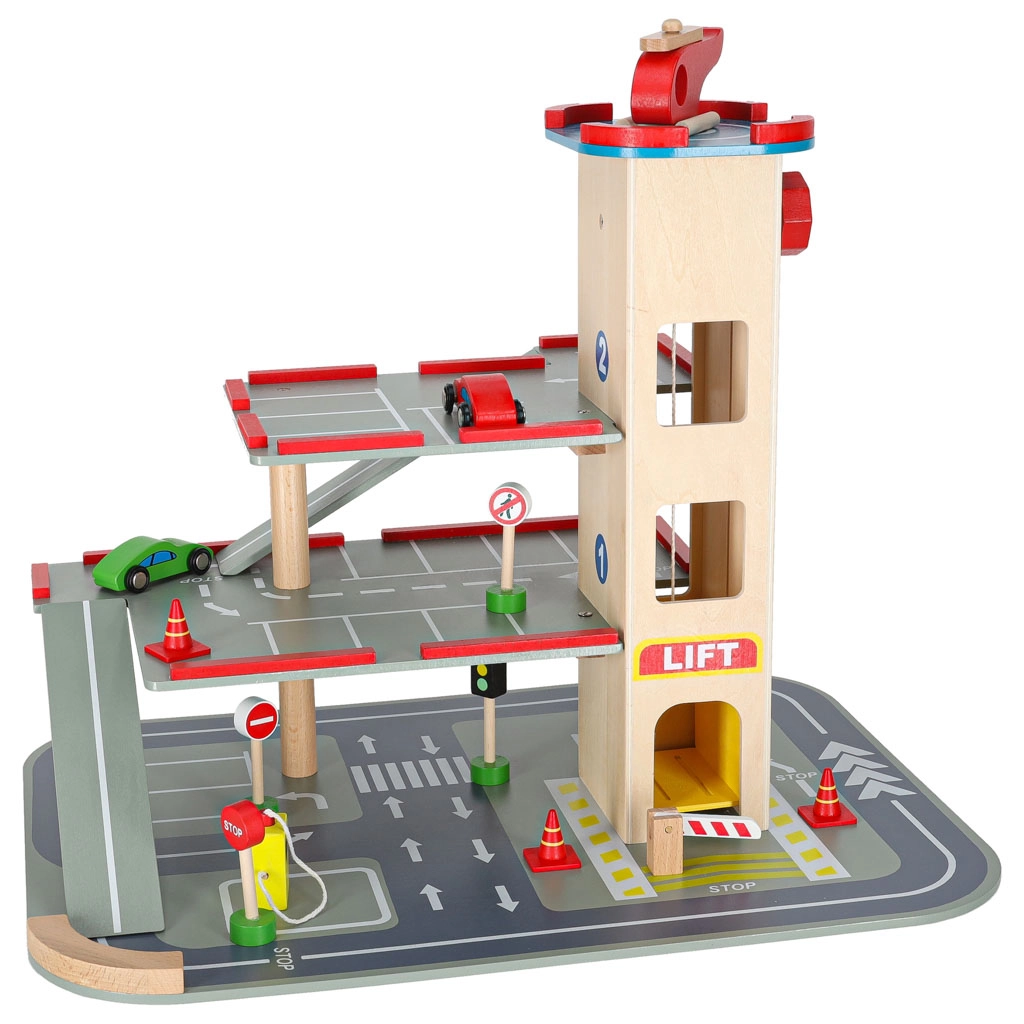 Questo garage in legno di qualità offre fino a 4 livelli di divertimento: tre piani per il parcheggio e un eliporto sul tetto. Grazie all’ascensore azionato a mano i bambini spostano facilmente le macchinine tra i piani e possono usare anche le rampe scorrevoli. Il set è ideale per sviluppare motricità fine, fantasia e per imparare le regole del codice della strada.