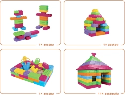 Il set da 33 pezzi in 3 forme permette di costruire torri, muri e casette in un formato sicuro che invita i bambini al gioco attivo e all’apprendimento.