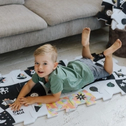 Tappetino in schiuma per bambini con motivi dei Treflíci in un elegante design bianco e nero, offre spessore superiore di 1,5 cm, superficie morbida e sicura per giocare e facile manutenzione. Con otto pezzi componi un'area di circa 117 × 60 cm, oppure un cubo o un tunnel – ideale per il gioco, la creatività e come decorazione elegante per la cameretta.