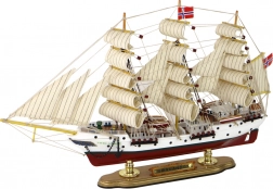 Questo modello di nave da collezione *Sorlandet* rappresenta una perfetta replica di una tradizionale nave a vela. La base in legno con il nome della nave aggiunge autenticità, mentre la bandiera norvegese in cima sottolinea l'origine della nave.