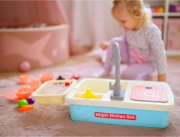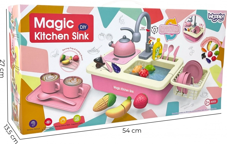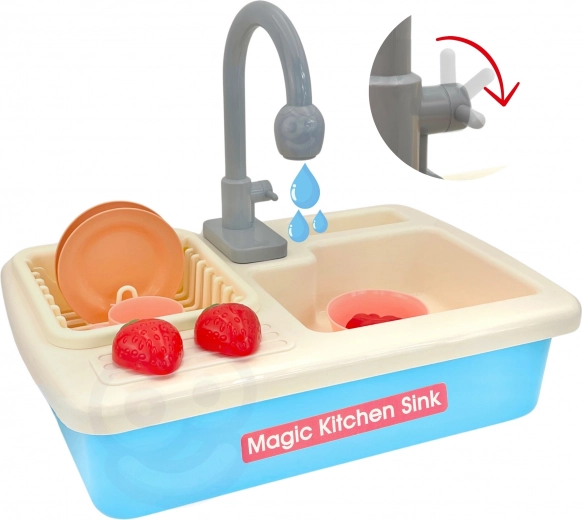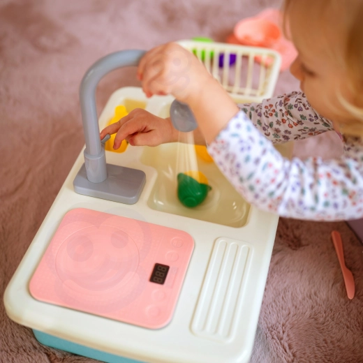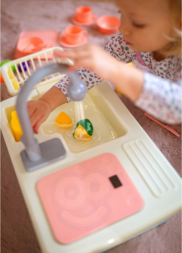 La pompa integrata, inserendo 2× AA, fa circolare l’acqua nel lavello. I bambini potranno divertirsi a sciacquare i piatti in modo realistico e a giocare in sicurezza senza disordine.