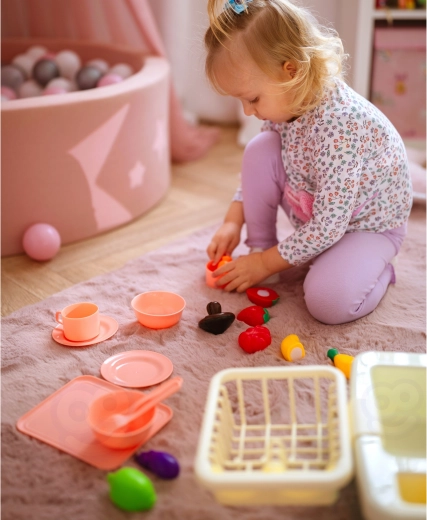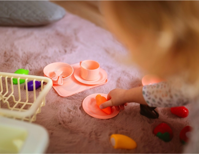 Il set include piatti, ciotole, tazzine, posate, teiera, tagliere e alimenti in plastica con chiusura a strappo (frutta e verdura) per un “taglio” sicuro. I bambini possono così preparare il menù, servire e poi lavare i piatti – dal gioco alla responsabilità il passo è breve.
