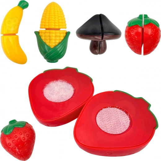 Banana, mais, fungo, fragole e altri pezzi si possono “tagliare” e riunire – ideale per allenare la motricità fine e imparare divertendosi.