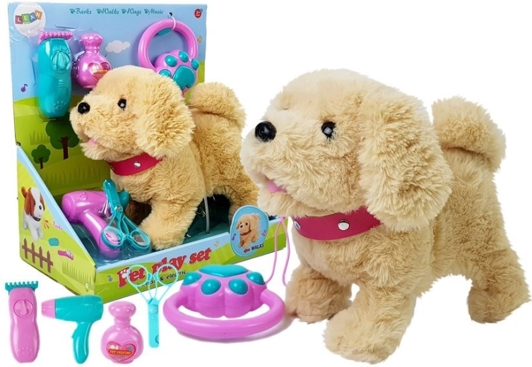 Cagnolino di peluche con guinzaglio, phon, tagliacapelli, forbicine, profumo