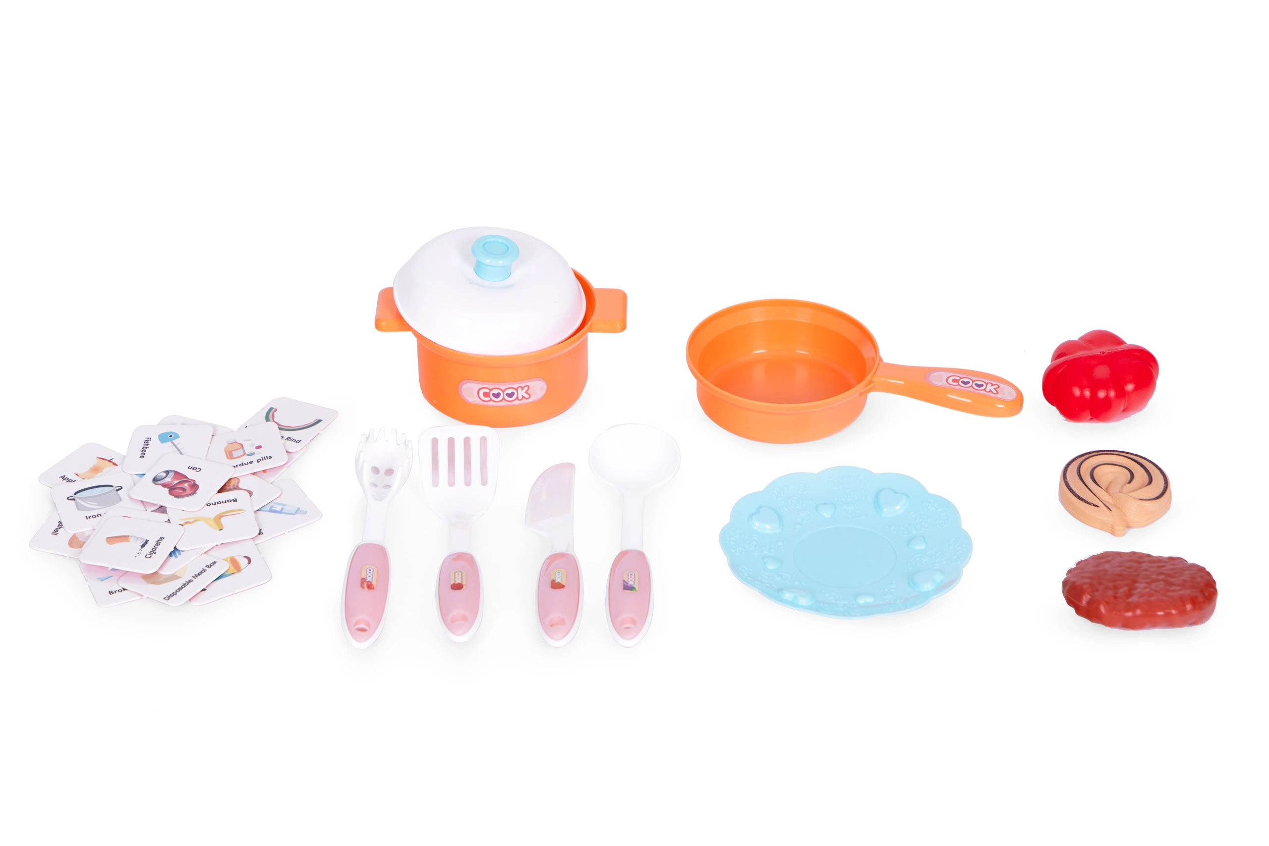 Pentole, padella, piattini, posate e alimenti, accompagnati da un puzzle che insegna la corretta differenziazione dei rifiuti: divertimento unito all’apprendimento.
