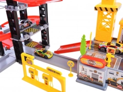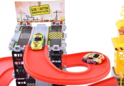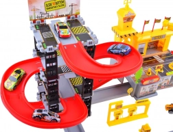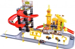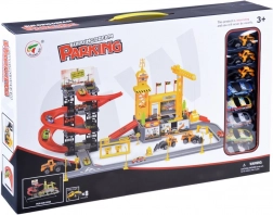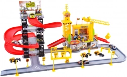 Costruisci la tua città! Parcheggio a quattro livelli con rampe, posti auto, stazione di servizio e segnaletica stradale collegato da un’ampia strada alla zona cantiere. I bambini possono parcheggiare le auto e partire con la squadra di costruzione, dove li aspettano gru, escavatore, bulldozer e martello pneumatico.