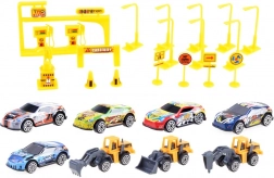 5 auto, 3 macchine da cantiere (escavatore, bulldozer, martello pneumatico), elementi del parcheggio e del cantiere, segnaletica stradale, stazione di servizio, gru