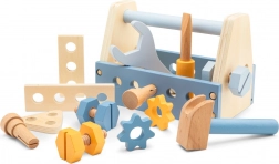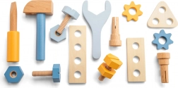 Scopri il set di attrezzi in legno per piccoli tuttofare dai 3 anni, che unisce divertimento e apprendimento. Il set con 16 pezzi (martello, cacciavite, chiave, chiodi, viti, ingranaggi) supporta lo sviluppo della motricità fine, della coordinazione occhio-mano e del problem solving. Realizzato in legno 100% certificato FSC per un gioco sicuro e sostenibile.