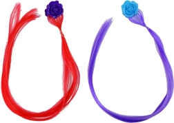 Il set include due ciocche sintetiche con mollette floreali - una rossa con una rosa viola e un'altra viola con una rosa blu.