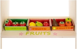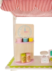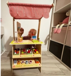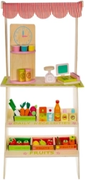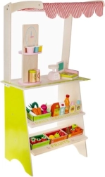 Regala ai bambini il loro mercato! Una elegante bancarella in legno con tetto a strisce, mensole e sezioni dedicate a frutta e beni di prima necessità stimola fantasia, comunicazione e motricità fine. Gli accessori realistici – cassa con scanner, carta di pagamento, bilancia e lavagna/“orologio” girevole – trasformano ogni spesa in un’avvincente avventura.
