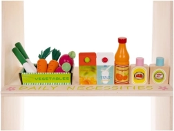 Cassa con scanner, bilancia, lavagna girevole e tanti alimenti in legno: tutto ciò di cui i bambini hanno bisogno per aprire il proprio negozio ed esercitare le abilità sociali.