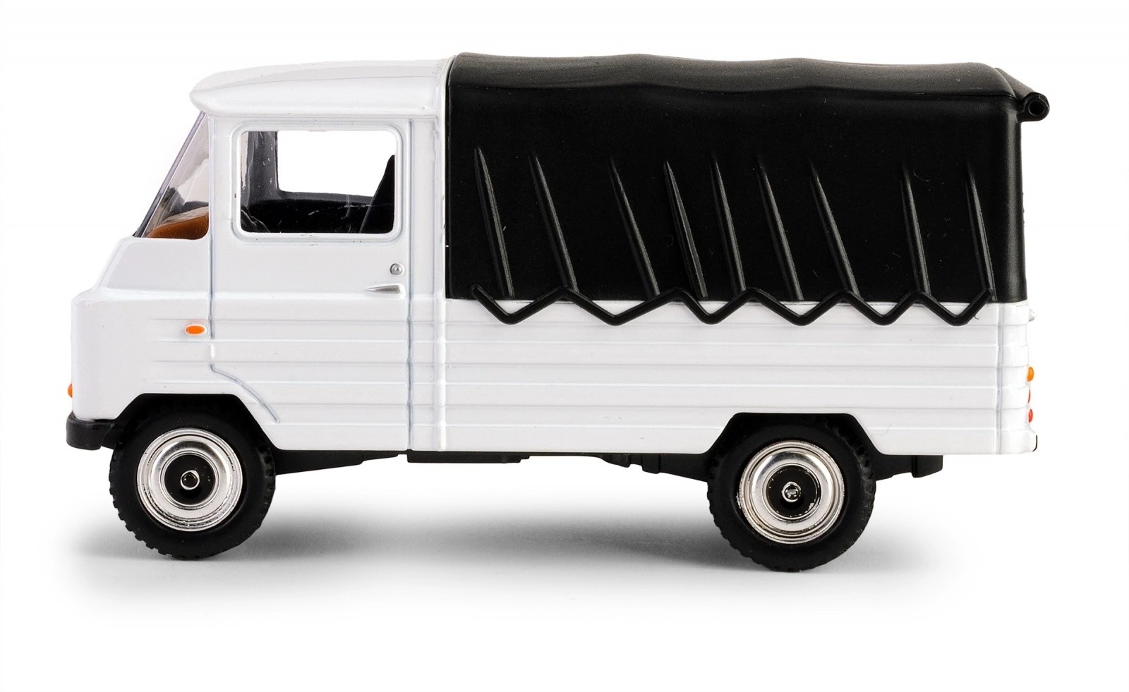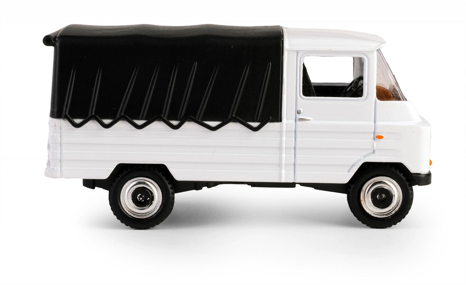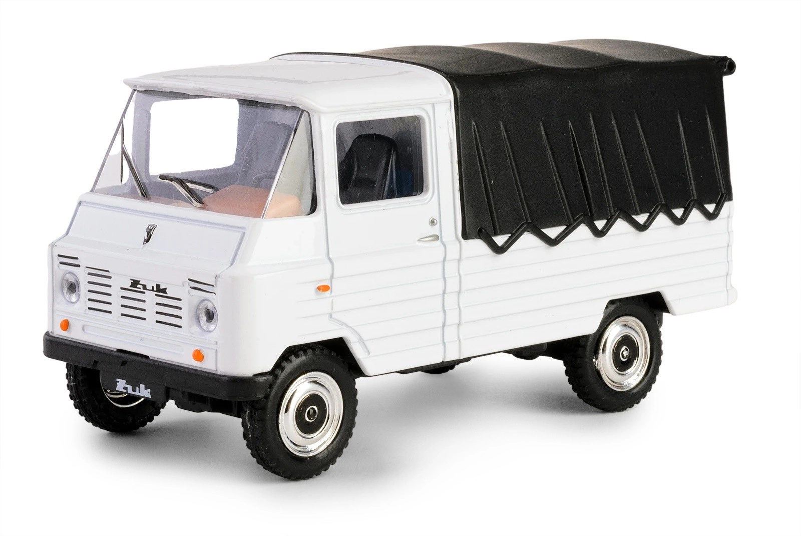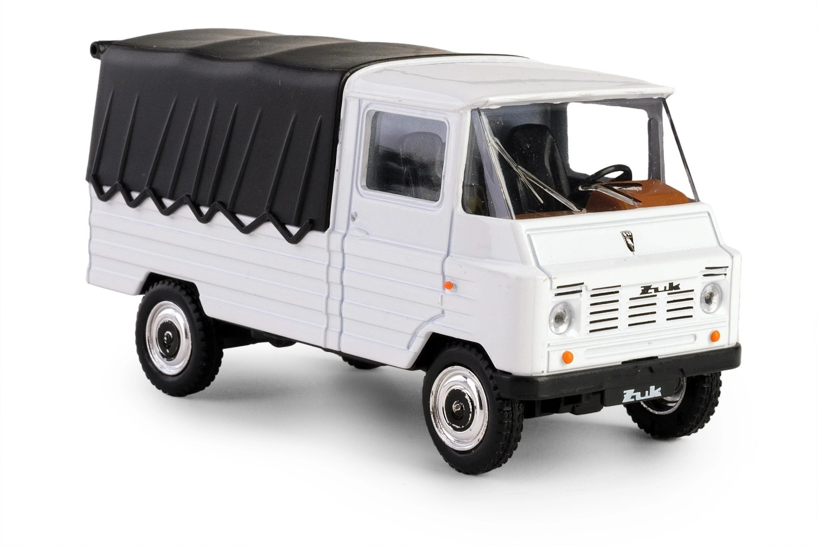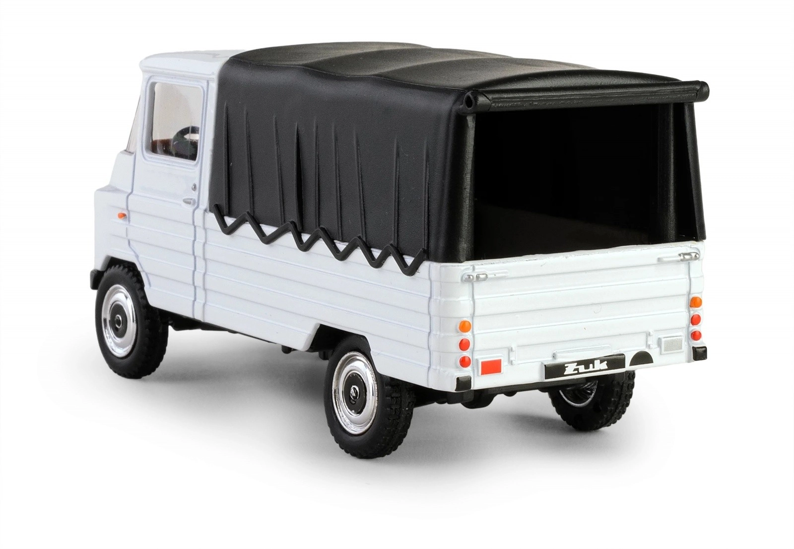 La carrozzeria bianca con telone nero e i dettagli accuratamente delineati di fari, calandra e ruote richiamano fedelmente il vero veicolo PRL ŻUK. Ideale per la vetrina e come decorazione di stile.