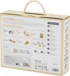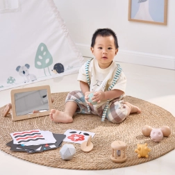 Set sensoriale completo per i più piccoli da 0–6 mesi che stimola vista, udito e tatto grazie a una combinazione studiata di strumenti. All'interno trovi carte ad alto contrasto, specchietto in legno, sonagli e palline tattili realizzati con materiali di qualità, incluso legno certificato FSC. Il set è pronto all’uso e perfetto anche come regalo.
