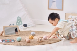 Uno specchietto resistente con cornice in legno aiuta durante il tummy time, favorisce il sollevamento della testolina, rafforza il collo e offre il primo contatto con il proprio riflesso. Ottimo per sviluppare autoconsapevolezza e abilità sociali.