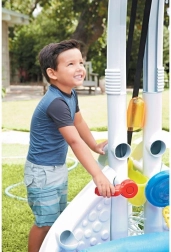 Scopri il centro acquatico multifunzione che trasforma ogni giardino o cameretta in un luogo pieno di allegria. I bambini possono regolare il flusso dell’acqua, riempire il contenitore spruzzatore, avviare la doppia cascata e guardare le palline rotolare lungo il nastro trasportatore per acqua/palline fino al secchiello superiore. La base gonfiabile aumenta sicurezza e comfort durante il gioco.