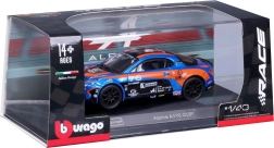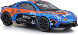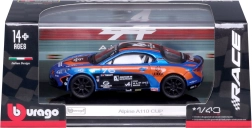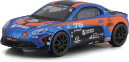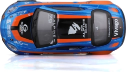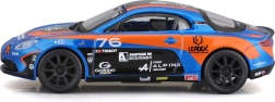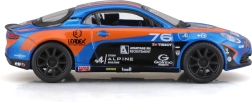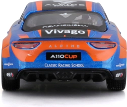Modello dettagliato dell’auto da corsa Alpine A110 Cup con l’iconica livrea blu‑arancione, proporzioni realistiche, stampe pulite degli sponsor e ruote liberamente rotanti per uno scorrimento fluido. Vetri oscurati, fari sagomati e silhouette aerodinamica enfatizzano il carattere sportivo dell’originale.