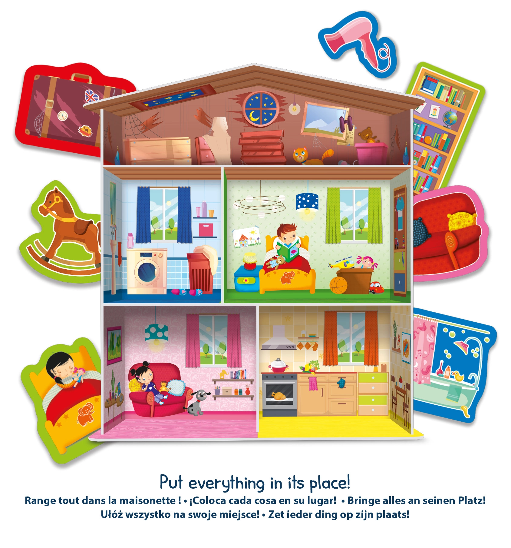 Il set include una casetta, puzzle a forma di elementi d’arredo e 15 supporti per cartoncini, grazie ai quali è possibile esporre ordinatamente gli elementi oppure utilizzarli per diversi scenari di gioco. Ottima scelta per bambini dai 3 anni, che imparano a classificare, nominare e creare le proprie storie.