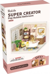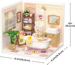Crea il tuo diorama da bagno in delicate tonalità pastello con vasca su piedini, specchio, mensoline e tanti accessori in miniatura. Grazie ai pezzi tagliati con precisione in materiali stabili assemblerai il modello facilmente e senza colla — il risultato è una scena in miniatura solida e splendidamente dettagliata, ideale su uno scaffale o come regalo.