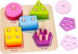 I bambini ordinano le forme colorate sui pioli corretti e nel frattempo imparano a contare 1–5 e a riconoscere i nomi inglesi delle forme sulla base.