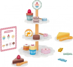 Questa elegante alzata in legno in stile pasticceria offre ai bambini un gioco realistico di servizio. Grazie ai 3 livelli, i piccoli pasticceri hanno spazio a sufficienza per cupcake, pasticcini e biscotti, mentre piattini e cucchiaini invitano a un allegro “tè delle cinque”.