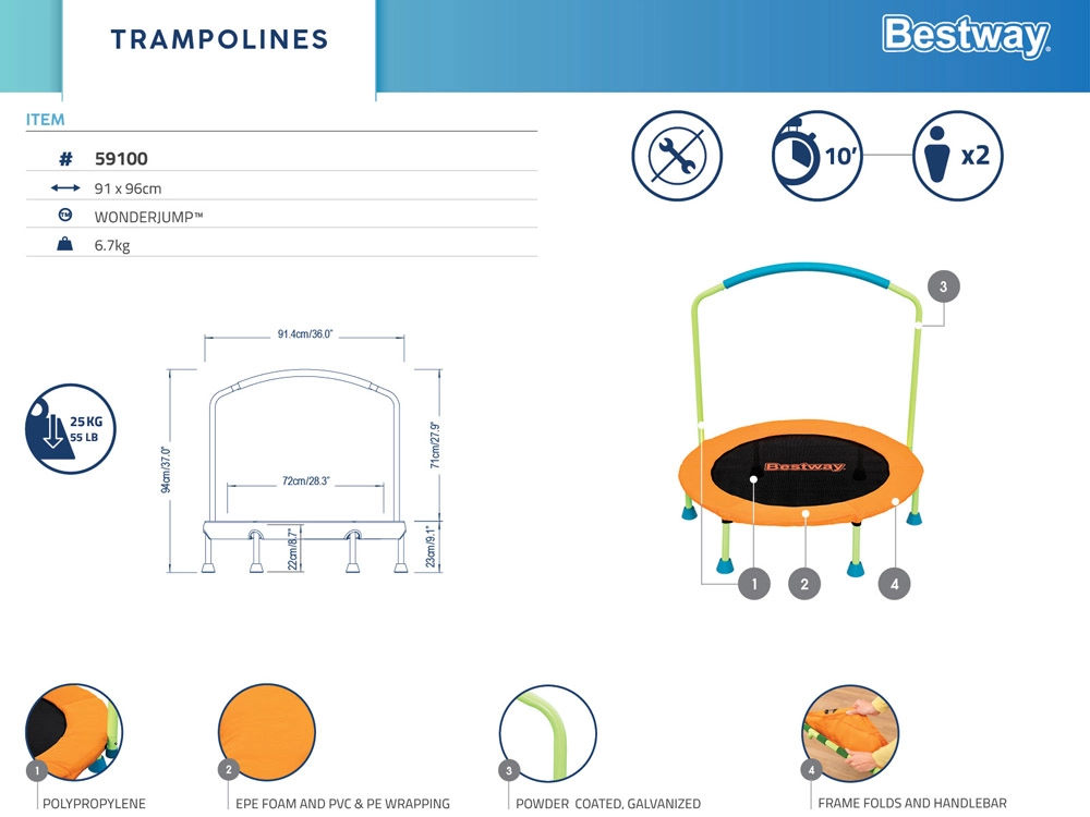 Bestway Wonderjump è una soluzione eccellente per chi cerca un trampolino durevole e sicuro per allenamento e svago. Ideale per la casa e per l’esterno, offre divertimento e un allenamento efficace.