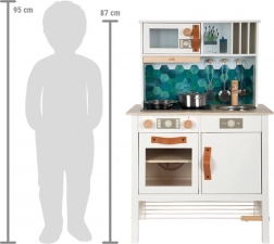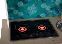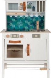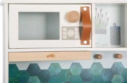 I bambini apprezzeranno i ricchi accessori: pentola con coperchio, padella e utensili da cucina in metallo. La teglia estraibile funge anche da lavagna per disegnare; il frigorifero e il forno hanno superfici interne stampate per un divertimento ancora maggiore. Il pannello posteriore è bifacciale: scegliete il design a piastrelle esagonali oppure la superficie completamente bianca che si adatta a qualsiasi interno.