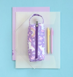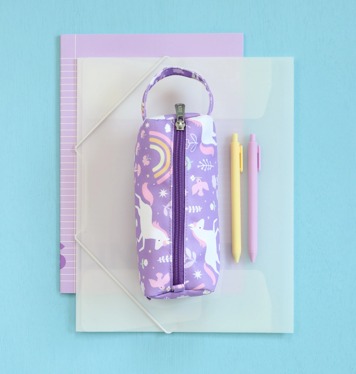 Astuccio viola per matite, pennarelli o articoli di cancelleria con motivi di unicorni, fiori e arcobaleno è realizzato in poliestere sostenibile. Ideale per la scuola, i viaggi o i club, si chiude con una zip e ha un comodo manico per un facile trasporto. Garantisce una conservazione sicura dei tuoi articoli di cancelleria.