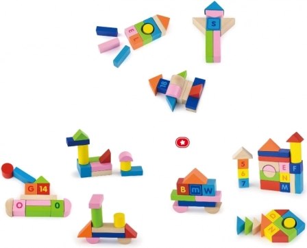 Blocchi colorati in legno resistente con stampe di lettere, numeri e simboli matematici: sostengono l’apprendimento attraverso il gioco e resistono all’uso quotidiano.