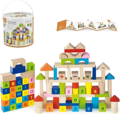 VIGA blocchi in legno 100 pz con lettere e numeri. Sicuri, colorati, in secchiello con manico. Sviluppano motricità, logica e l’apprendimento di alfabeto e calcolo.