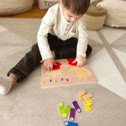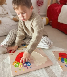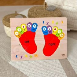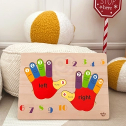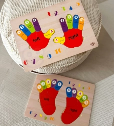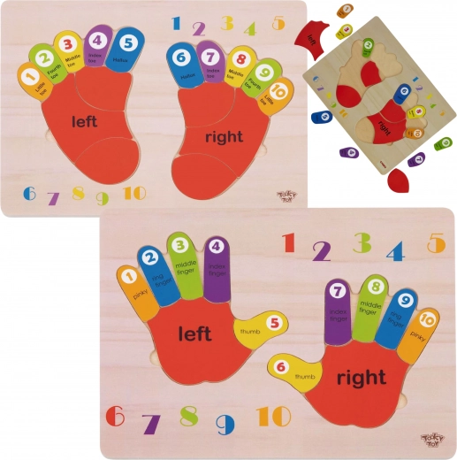 Puzzle educative in legno mani e piedi del marchio Tooky Toy è un'ottima risorsa didattica per imparare a contare, riconoscere i lati e i colori. Ideale per l'apprendimento dell'inglese! La tavola e tutti i suoi elementi sono realizzati in legno di alta qualità, perfettamente adattati alle dimensioni dei piedi dei bambini. Questo gioco è una risorsa eccellente per i piccoli che iniziano la loro avventura matematica. Le mani e i piedi colorati sono indicati per il lato destro e sinistro. Ogni dito ha un numero assegnato, così che il bambino possa applicare le sue conoscenze contabili sulle proprie dita una volta che capisce il principio. Inoltre, ogni dito ha un colore designato, il che aiuta a distinguerli facilmente. Le dita colorate sulla tavola sono descritte chiaramente con i nomi - l'apprendimento non deve essere noioso!