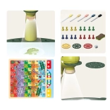 5 pennarelli cancellabili a secco, spugnetta, 3 dischi di proiezione, 2 giochi da tavolo (Non t'arrabbiare!; Scale e Serpenti), dado e pedine