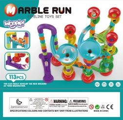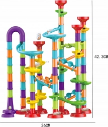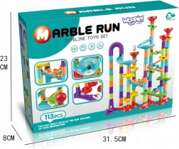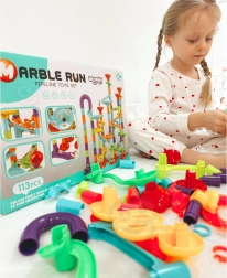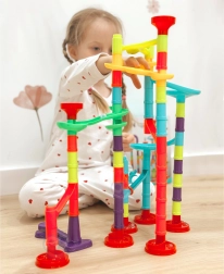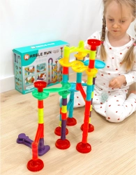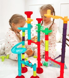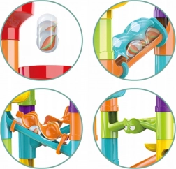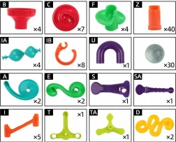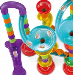Tubi, curve, spirali, imbuti e pilastri diversi permettono di costruire ogni volta una nuova e divertente pista per biglie. Segui le istruzioni oppure crea percorsi fantasiosi.