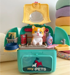 Una volta aperto, diventa una stazione di gioco con lavello, rubinetto, ripiani e ganci per gli accessori. I bambini possono fare il bagnetto alla gattina, pettinarla e nutrirla, vivendo situazioni realistiche.