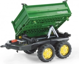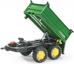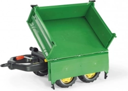 Il rimorchio Rolly Toys è un robusto rimorchio ribaltabile a due assi che può inclinarsi su tre lati. Questo rimorchio verde è dotato di ruote robuste, che consentono un facile trasporto del carico. È compatibile con tutti i veicoli Rolly Toys, ad eccezione dei modelli rollyKids e RollyDumperKid.