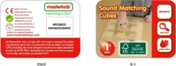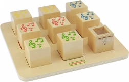 Il set include una tavola e otto blocchi di legno che emettono suoni diversi quando vengono scossi. L'obiettivo del bambino è trovare le coppie giuste in base ai suoni.