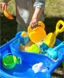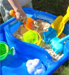 Le pratiche vasche doppie consentono un gioco pulito senza mescolare acqua e sabbia. I bambini possono contemporaneamente raccogliere, travasare e modellare.