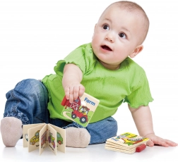 Pagine in legno con bordi arrotondati e superficie rifinita con colori atossici. Il robusto cordoncino rosso mantiene il libretto unito e facilita la sfogliatura.