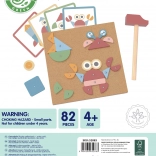 Set completo con forme in legno, chiodini, martelletto e base in sughero. I bambini possono comporre seguendo i modelli o lasciarsi guidare dalla fantasia.